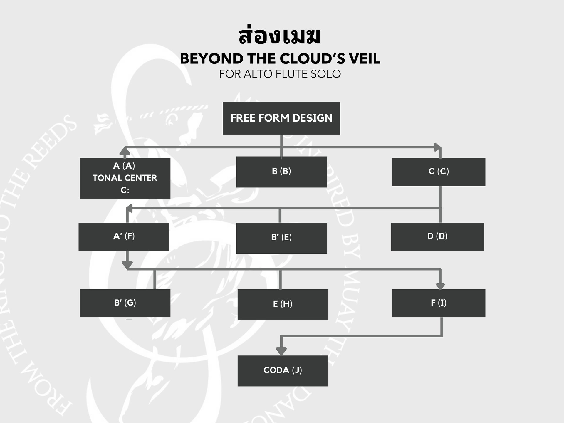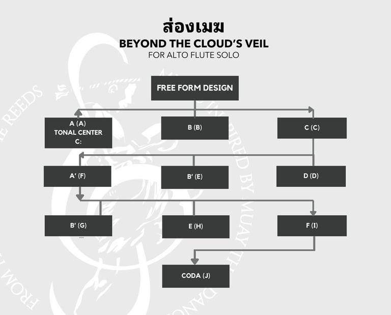 "Beyond the Cloud's Veil," a solo composition for alto flute by is a masterful work that exemplifies the seamless fusion of traditional Thai music and contemporary musical concepts. The composer drew inspiration from the performance of the Pi Chawa (a traditional Thai oboe) in the Thai classical piece "Sarama" by National Artist Kru Jamnian Srithaiphan. By meticulously selecting and adapting the melodic material to suit the unique characteristics of the alto flute, the composer has created a piece that not only showcases the instrument's rich, mellow timbre but also bridges the gap between Thai and Western musical traditions. The work ingeniously incorporates various extended techniques, such as flutter-tonguing, glissandi, and harmonics, to evoke the distinctive sound of the Pi Java, despite the inherent differences between the two instruments. The composer's adept use of these techniques, combined with the exploitation of the alto flute's wide range, particularly its warm, golden lower register, results in a composition that is both captivating and innovative. "Beyond the Cloud's Veil" combines traditional Thai musical elements with contemporary Western instrumentation and compositional techniques. This piece explores the possibilities of cross-cultural musical integration, aiming to transcend cultural boundaries and offer a new perspective on musical expression.