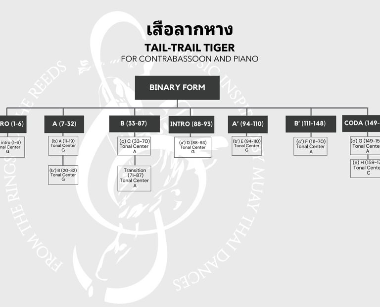 "Tail-trail Tiger" for contrabassoon and piano is a captivating piece inspired by the Muay Thai dance movement of the same name. This composition vividly brings to life the calculated movements of a tiger stalking its prey, much like a Muay Thai fighter assessing and strategizing against an opponent. The slow, deliberate motions aim to mislead and catch the adversary off-guard, leading to a sudden and powerful attack.The contrabassoon's wide range and unique timbre make it an ideal instrument to convey the tiger's deceptive stillness and latent power. Its ability to produce deep, resonant tones, as well as soft, delicate high notes, reflects the dual nature of the tigerseemingly benign yet inherently dangerous. The use of varied tonal qualities in the contra bassoon portrays the complex strategies and emotions of the tiger, showcasing the concept of "Musical Metaphor." The composition's structure allows for continuous development and variation, mirroring the evolving nature of the tiger's stalking movements. The contra bassoon's rich, dark sounds and intricate techniques, such as multiphonics and glissandi, paired with the piano's supportive ostinato patterns, create a dynamic and immersive listening experience. "Tail-trail Tiger" masterfully blends elements of traditional Thai music with Western classical forms, offering a profound exploration of cross-cultural composition. The interaction between the contrabassoon and piano not only highlights the technical prowess required but also enriches the piece with depth and emotional intensity. This innovative composition stands as a testament to the creative fusion of different musical traditions, delivering a powerful narrative through its vivid and evocative soundscape, and showcasing the contrabassoon's potential as a solo instrument.
