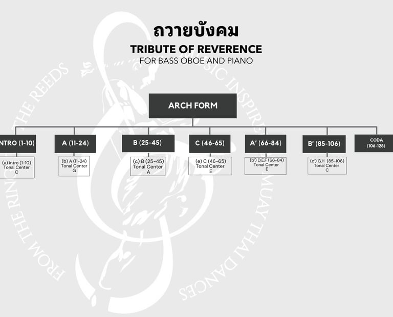 "Tribute of Reverence" for bass oboe and piano draws its inspiration from traditional Thai dance movements, particularly those associated with Muay Thai. This piece presents a unique challenge due to the bass oboe's distinct and rarely heard sound. Unlike its more common relatives, the bass oboe offers a deeper range and a unique timbre, similar to the bassoon but with a smaller, sharper tone. The composer aims to showcase the instrument's full potential, requiring a performer skilled in playing both the bass oboe and its counterpart, the cor anglais. This composition is groundbreaking in Thailand, as it represents one of the few solo pieces written for the bass oboe. It combines the nuanced gestures of the "Tribute of Reverence" dance, symbolizing respect and loyalty, with a musical interpretation that mirrors the graceful movements and formal postures of Thai traditional dance. Structured in an arch form, the piece creates a balanced and unified musical experience. This form allows the melody to build, peak, and then return to its original theme, offering listeners a cohesive and engaging journey. The composer integrates traditional Thai musical elements, such as the rhythmic patterns of Thai drums, into the piano accompaniment, enhancing the piece's cultural depth and emotional impact.